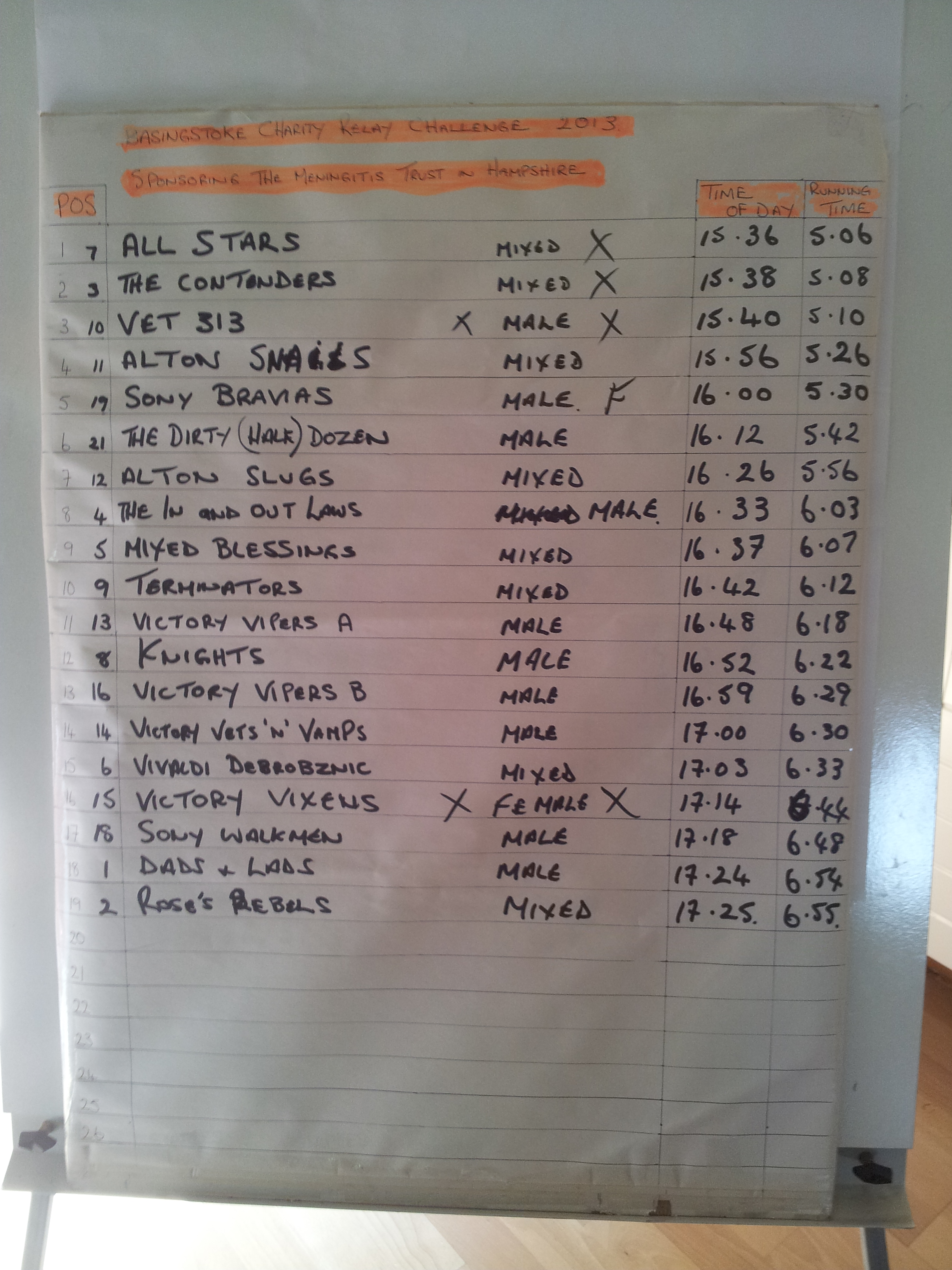 The purpose of the relay (apart from having fun) is for teams to raise money for the years nominated charities (see below) in addition to the race entry fee. A suggested sponsor form is available for download, or you can setup your own JustGiving or similar page.